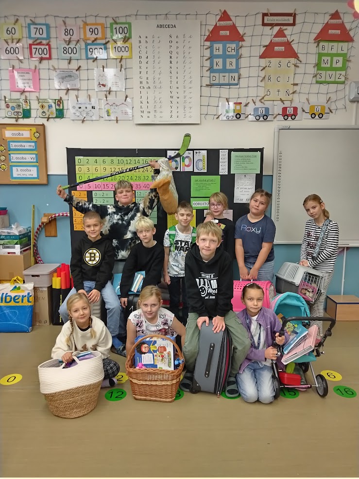 I naše třída se do této akce zapojila. A opravdu nápady byly zajímavé, originální a kreativní. Školní pomůcky se objevily v kufrech, v proutěných košících, taškách na kolečkách, krabicích, pytlích, přepravkách pro zvířata, svázané v kusu látky a v kočárku.